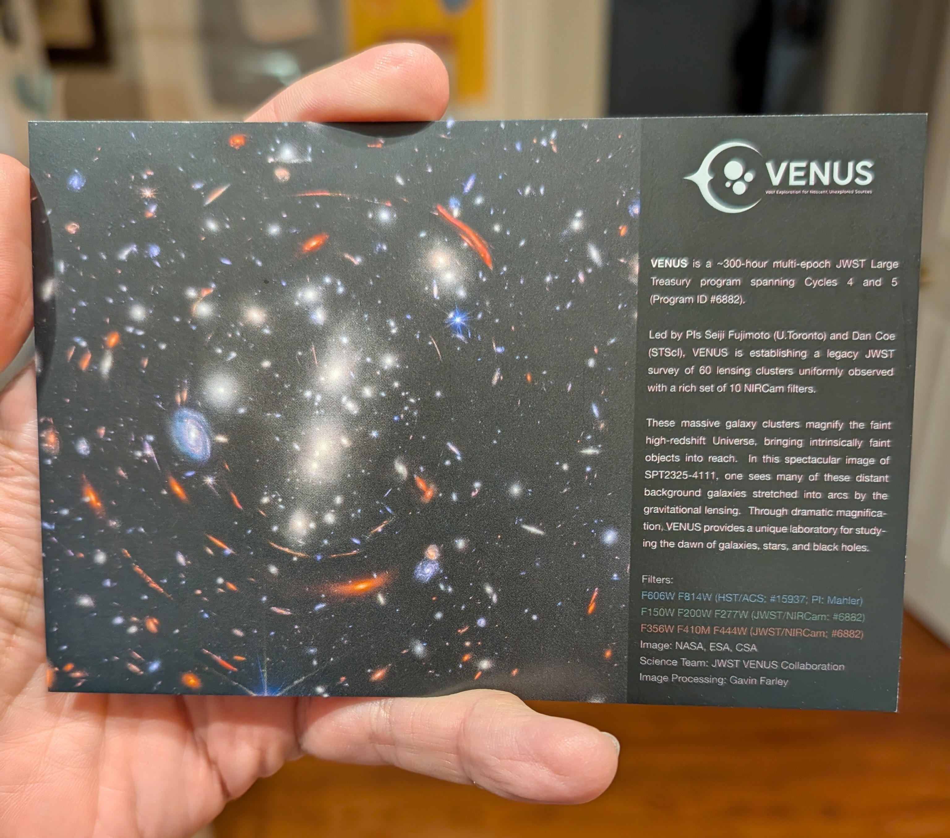The official VENUS 2026 postcard, featuring the stunning gravitational lens system in the SPT2325 cluster, was officially released at the 247th AAS meeting. We are proud to share this visual milestone with the global astronomical community.
